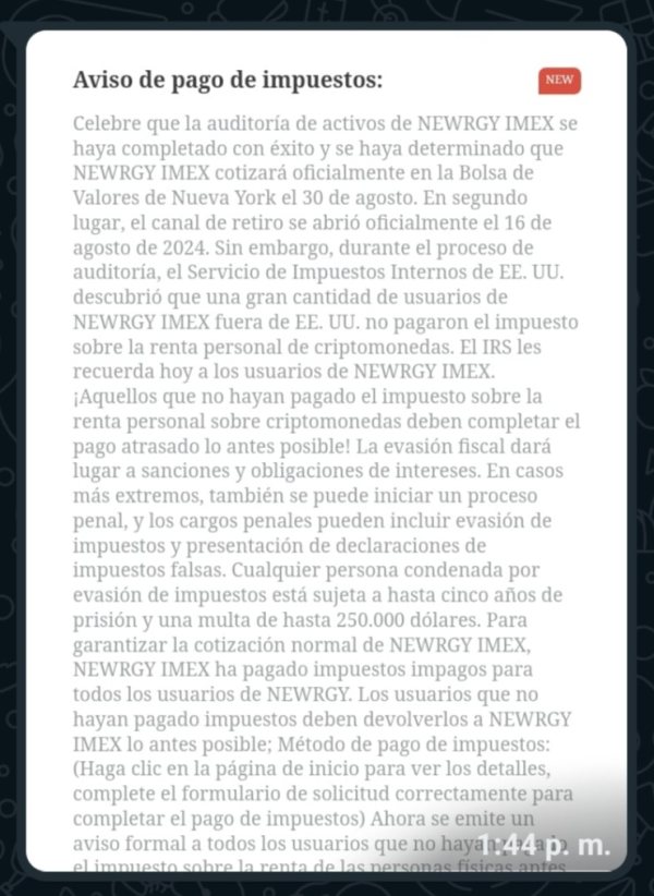 NEWRGY IMEX no me deja retirar mi dinero, me decían que la aplicación estaba siendo regularizado, hasta el 16 de agosto, y hoy me informan que debo depositar otra cantidad para poder retirar y sería hasta el 26 de agosto, pero ya no responden y no me dejan realizar nuevamente la solicitud de retiro