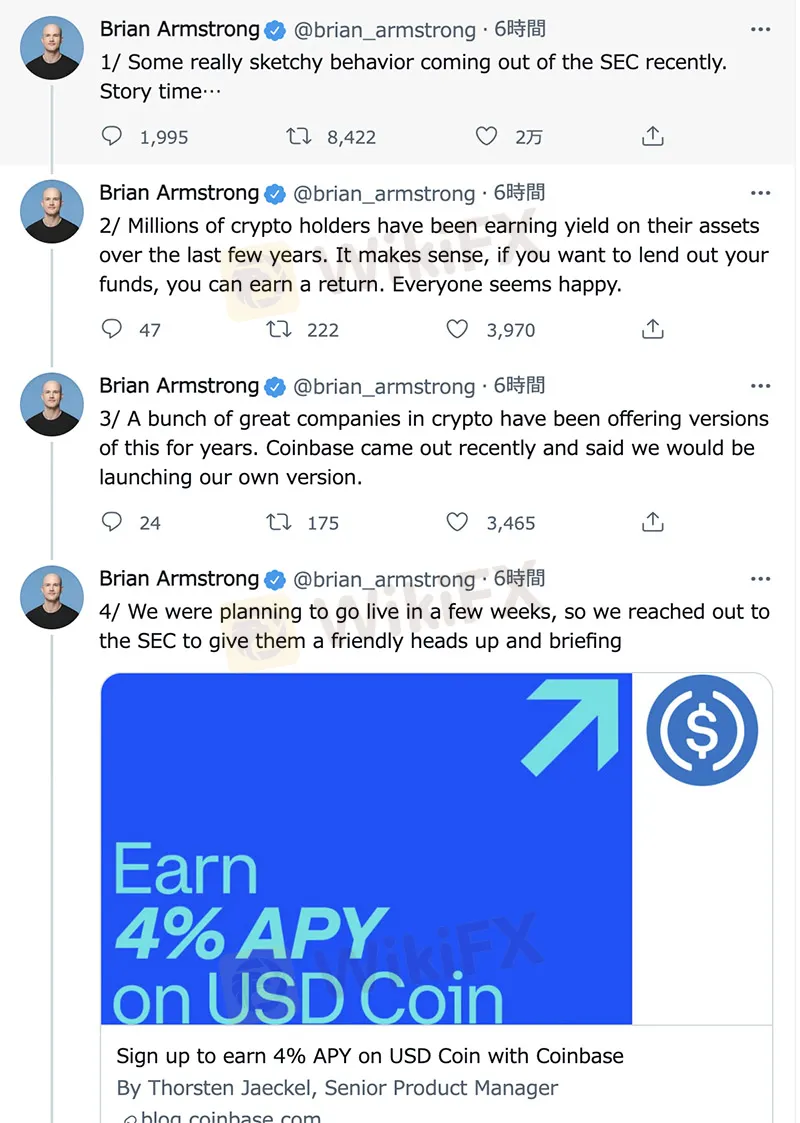 概要:WikiFX:CoinbaseのCEOがSECから新サービスへの「圧力」をツイート、暗号通貨規制の明確化を要求
