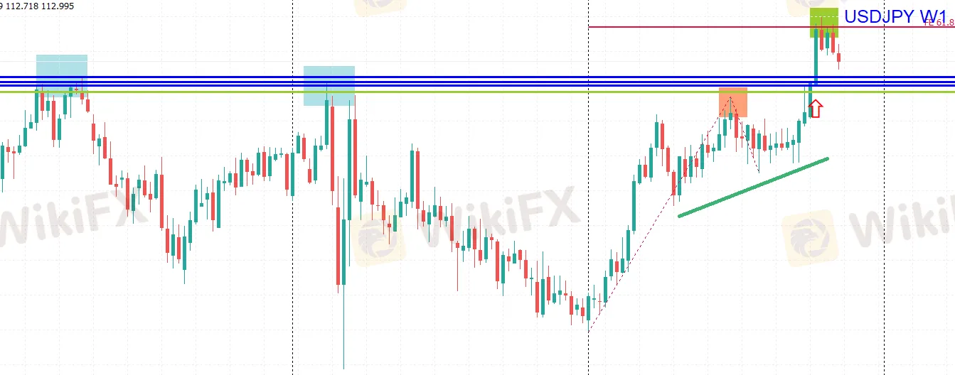 チャートは日足。「112.30」~「112.397」にカンファレンスK(フィボナッチレベルの重複ポイント)が確認できる(青色四角)。週足の抵抗帯はオレンジで表示しており、その上限帯とも一致。ここが強いサポートになると考えている。
