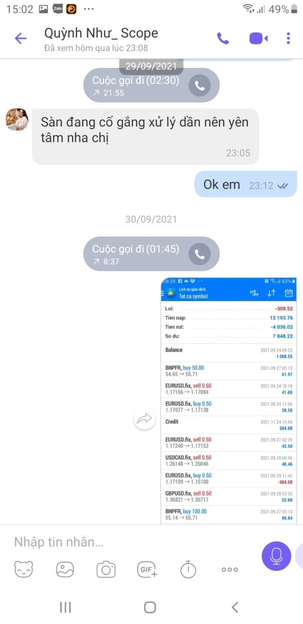 Ngày 29/09 sau khi tôi đã nạp tiền lần 3 , đang giao dịch thì tự nhiên lệnh tài khoản văng ra khiến các lệnh đang giao dịch bị nhảy ra ngoài, khi tôi hỏi thì nhân viên đọc lệnh tên Quỳnh Như sdt 0374169005; 0846663224 nói là do sàn chuyển dư bonus nên rút lại, mặc dù hứa là cho tôi 100% bonus nhưng chỉ cho tôi 50% bonus, khi tiền bị rút làm tài khoản tôi bị âm, các lệnh đang giao dịch văng ra ngoài và tự chốt lỗ