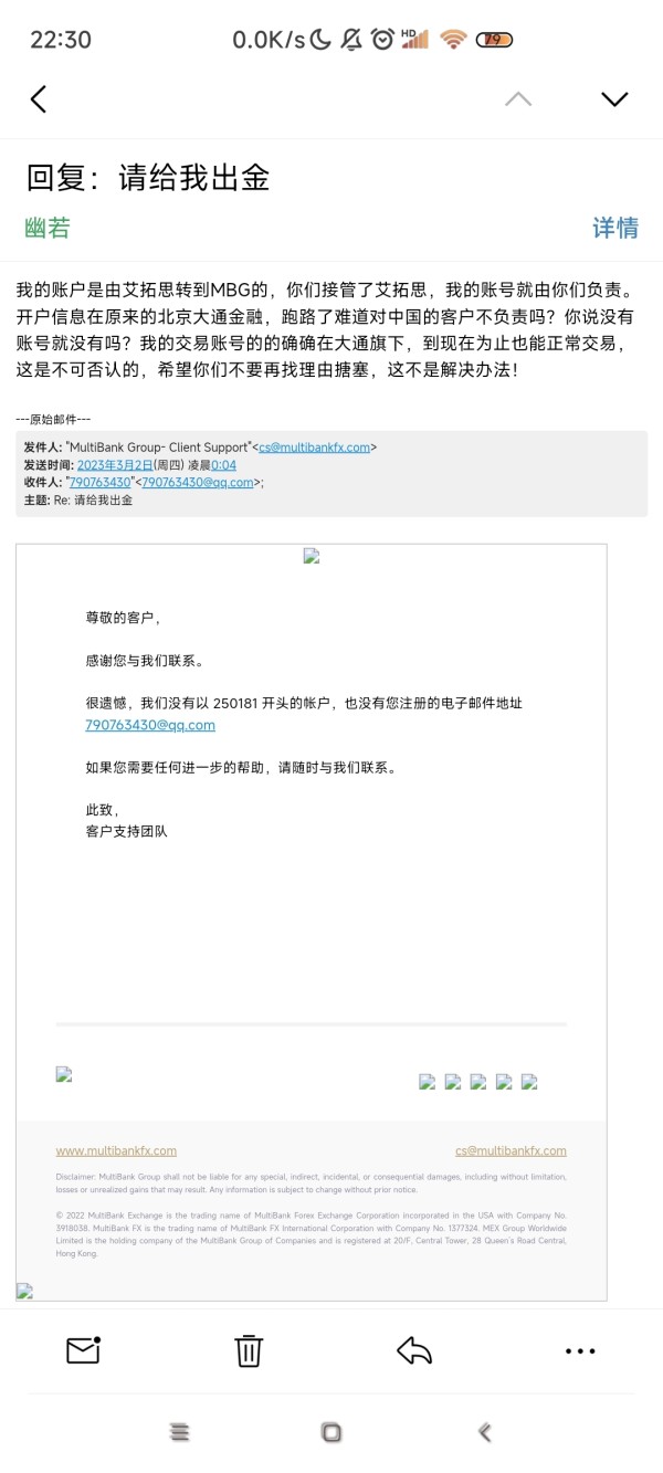 大通金融不给出金,反复推脱,睁眼说瞎话,邮件回复没有我的账号,没有我的邮箱,以下截图是我账号的真实截图,可正常交易,交易商一目了然。此账号是由艾拓思转到MBG的,人家退出中国市场前,都能妥善处理客户资金,给客户一个交代;而MBG是大通金融品牌,消失一年半,现在出现了,却不承认以前客户的账号和交易,耽误这么久的时间,给我经济上造成极大的困难,我不要求赔偿,只要仅剩的净值,这是属于我自己的钱,出金给我天经地义,希望你们尽快出金,不要再败坏名声!