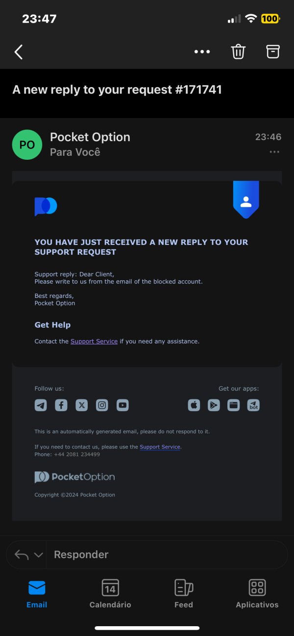 A plataforma não responde os e-mails que envio ao suporte, estão mentindo dizendo que usei meu saldo em negociações no qual sabem que é mentira por tanto que já me enviaram mensagem dizendo que haviam pago meu lucro e a cubopay havia retido meu dinheiro,já inventaram várias mentiras contraditórias para não pagar o lucro que eles reterão da minha conta que foi bloqueada,estão dizendo que reembolsaram meus fundos de depósito no qual também é mentira pois a Payretailers me enviou e-mail provando que eles não haviam autorizado nenhum reembolso,hoje está com 293 dias que meu lucro $6767 foi retido por eles e a conta bloqueada! 62 dias se passaram após eles me enviarem uma mensagem que meu reembolso estava sendo processado e levaria de 30-60 dias para ser feito! QUERO DEIXAR MINHA TOTAL INDIGNAÇÃO COM A PLATAFORMA! NÃO DEPOSITEM DINHEIRO NESTA CORRETORA ,O SUPORTE NÃO É SOLÍCITO , NÃO RESOLVEM OS PROBLEMAS DOS CLIENTES,MENTEM E USAM FALSAS INFORMAÇÕES PARA NÃO PAGAR OS LUCROS,DEBOCHAM DOS CLIENTES ! NÃO SÃO UMA EMPRESA IDÔNEA! EU TENHO AS PROVAS DE TUDO E DE TODAS MENTIRAS CONTADAS POR ELES. POCKET Option reembolse meu saldo $6767