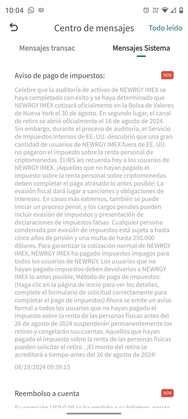 Desde el día 8 de agosto retuvieron los fondos sin permitir retiro alguno con la noticia de que entrarían en Auditoría y hasta el día 16 se abriría el canal para poder hacer retiros normalmente,mientras estuvo la supuesta lider "chen" alentando a ingresar mas dinero con supuestos premios este fin de semana. el caso es que hoy que se esperaban ya los fondos nos salen con que teníamos que pagar 20% de impuestos para poder disponer de nuestro dinero.