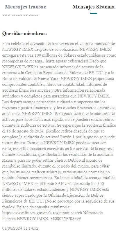 la pagina ya no te permite hacer retiro de fondos, argumentando que debes pagar el ISR, todo esto por una supuesta auditoria que se llevó a cabo del 6 al 16 de agosto. en los grupos de WhatsApp, una cómplice de esta estafa cuyo seudónimo es HEBE, sigue enviando mensajes a todos los miembros argumentando que, depositando más dinero para pagar los impuestos es la única forma de recuperar el capital invertido y que no se puede tomar ese capital de la propia cuenta del inversor. Desafortunadamente la desinformación y ambición o necesidad de muchos de nosotros nos llevo a confiar en este tipo de estafas, y cientos de personas ahora han perdido todos sus ahorros. NO CREAN EN ESTE TIPO DE ESTAFAS, EL DINERO FACIL Y RAPIDO NO EXISTE DE BUENA MANERA, NOS TOCÓ APRENDER A LA MALA, PERO ESTO PUEDE AYUDAR A QUE TU NO CAIGAS EN FRAUDES DE ESTE TIPO Y, SI ESTAS EN ALGUNO, TE RETIRES DE INMDIATO.