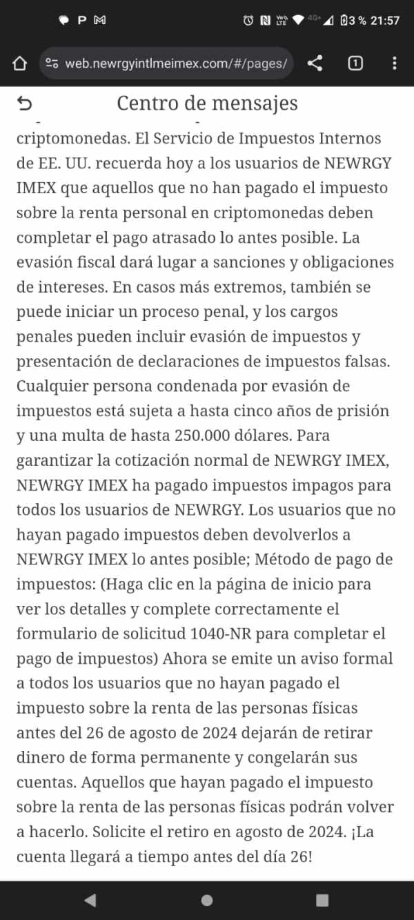 Invertí más de 6 mil dólares a la plataforma de Newrgy para trabajar en trading y desde el día 5 de agosto bloquearon la función de retiro de manera general con el supuesto argumento de una auditoria para cotizar en la bolsa de NY. Ahora está cobrando un 20% del total de los fondos por concepto de impuesto IRS, de no cubrir este pago antes del 26 de agosto, nuestra cuenta queda congelada definitivamente. esto a mí como a más personas nos perjudica ya que invertimos cantidad importante de nuestro patrimonio. espero me puedan ayudar a recuperar el dinero que invertí y está congelado dentro de la plataforma.