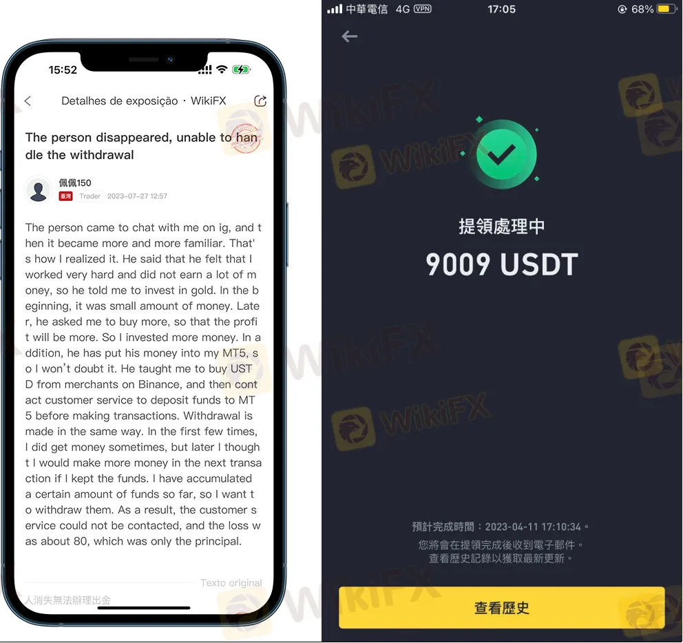 Segundo a descrição da vítima: No início, a outra parte conversava com ela no Instagram como pretendente, e depois foram se conhecendo cada vez mais. O mentiroso disse que ela achava que trabalhava muito e não ganhava muito dinheiro, então ele a levou para investir em ouro. No início, era um investimento pequeno e lucrativo. Mais tarde, sob a tentação do mentiroso para aumentar o investimento e obter mais lucros, a vítima aumentou o investimento de capital. Além disso, o golpista colocou seus próprios fundos no MT5 da vítima, então a vítima não suspeitou que a outra parte era um golpista.