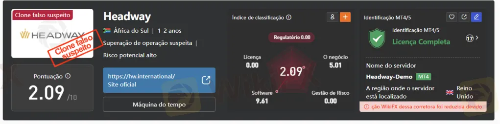 A corretora Headway é um provedor de serviços financeiros que oferece negociação em vários instrumentos, como forex, ações, metais preciosos e índices. Apesar de afirmar operar com uma licença da Financial Sector Conduct Authority (FSCA) da África do Sul, a plataforma WikiFX identificou essa licença como um clone suspeito, o que levanta dúvidas sobre a legitimidade da regulamentação. A corretora tem uma pontuação de 1,20 em 10 na avaliação do WikiFX, indicando alto risco. A Headway oferece acesso às plataformas de negociação MetaTrader 4 (MT4) e MetaTrader 5 (MT5) e disponibiliza três tipos de contas com diferentes condições de negociação. No entanto, enfrenta críticas em relação ao suporte ao cliente e à falta de transparência nos custos
