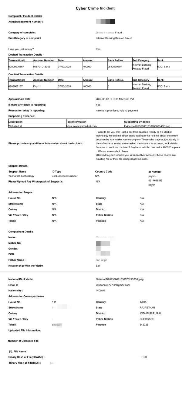 Ya market is scammer nd Froud company because hi is not giving refund my money And I have got FIR them done again