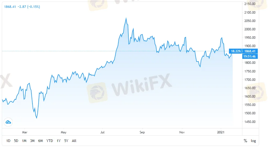 Новости WikiFX (21 января) - В среду Джо Байден официально вступил в должность президента США, став 46 президентом американских штатов. Реакция золота на эту новость была положительной, после чего золото прорисовало V-образное ралли. Спот-золото подскочило до 1850 долларов за унцию с 1832,30 доллара после достижения максимума в 1860 долларов.