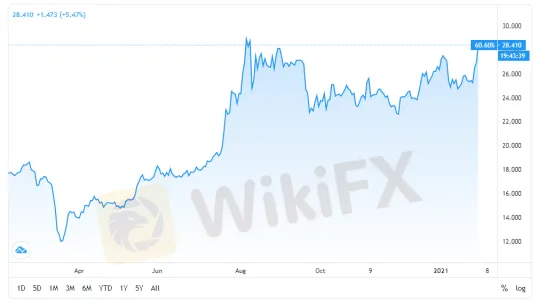 Абстракт:Серебро открыло азиатскую торговую сессию в понедельник ростом до 6% до 28,8 доллара за унцию. Цены на серебро могут вырасти на фоне подпитываемого Reddit бума на серебро с очень короткими продажами.