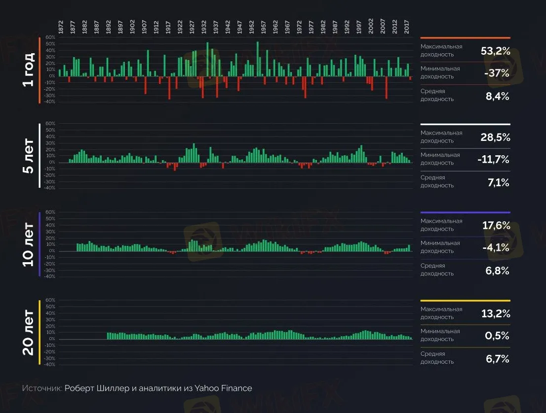 Абстракт:При долгосрочных инвестициях риск потерять деньги меньше. Этот тезис доказал американский экономист Роберт Шиллер и аналитики Yahoo Finance. Они проанализировали движение индекса S&P 500 с 1872 по 2018 гг.