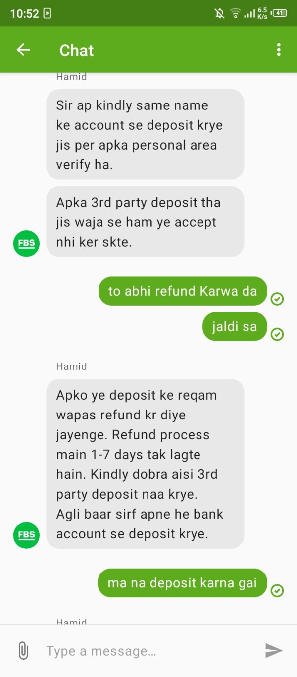 Ma na fbs par deposit kia.but unho na kaha ka third party not allowed.or 7 din ka aandar ap ko refund mil gaye ga.lakin 7 din ho gai or abhi tak nahi mila refund.