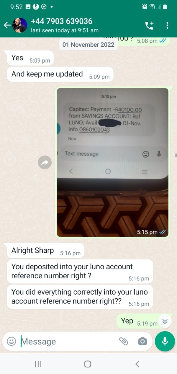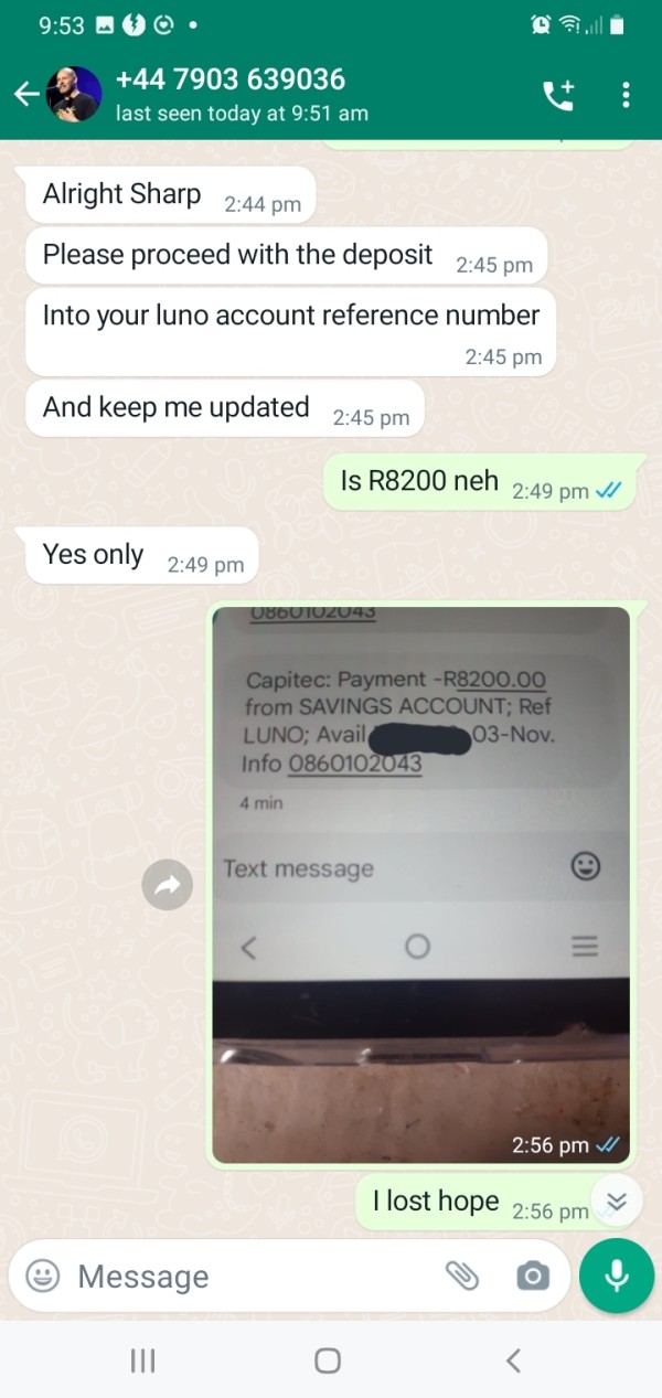 I deposited the amount of R180000 into luno account thn Mr Joseph Lubin and Lovedalia Nthabiseng took my money until today i never received my withdrawals they still want R38000 from me to do my withdrawal another lady from valr account took my R25800 saying she will help me to recover my lost funds since tht day I never heard from her again