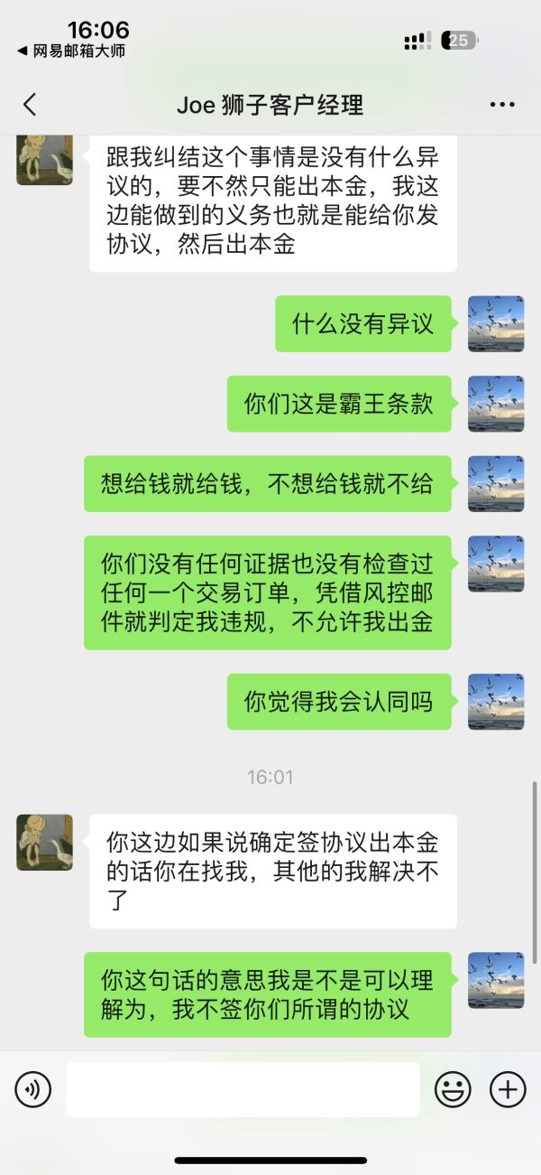 联系官网的客服,询问出金问题,这个客服转接到另一个客服,同样不回答任何问题,都是已读不回,联系客户经理之后,他们回复,说明风控部门检测到我的交易存在违规,我要求他们指明我哪一条的交易订单存在违反他们狮子的交易规则,客户经理说明不知道,后面有说明如果我还想出本金的话就必须签署他们平台的交易违规责任协议书,我并不存在违规行为,他们平台是想给你钱就给,不想给就不可能给,这个平台就是只能进不能出!