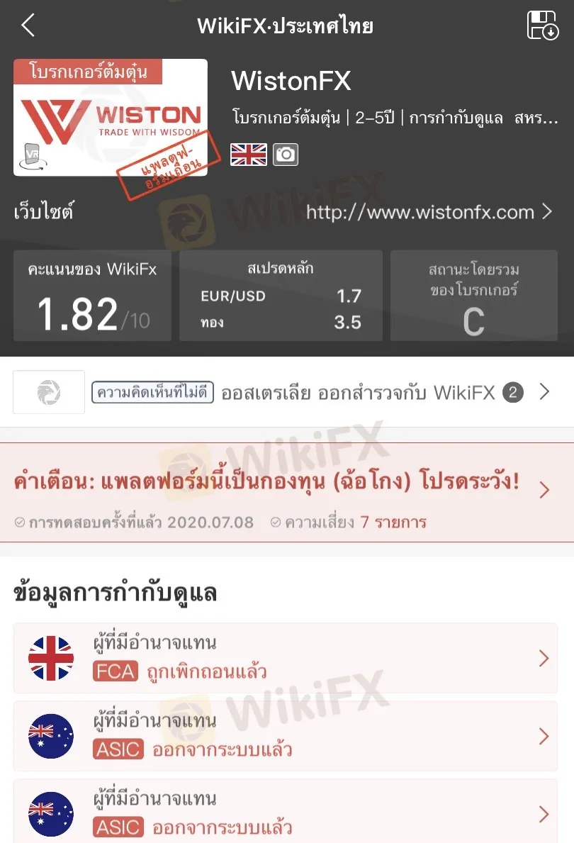 WintonFX มีคะแนนอยู่ที่ 1.82 และใบอนุญาตทั้งสองได้ถูกถอนออกแล้วนั่นคือ FCA และ ASIC ในปัจจุบันโบรกเกอร์นี้ยังไม่มีการกำกับดูแลจากหน่วยงานไหน แถมเมื่อหลายเดือนที่ผ่านมาโบรกเกอร์นี้ได้ถูกร้องเรียนเข้ามาเป็นจำนวนมาก ทำให้ตอนนี้ได้ถูกจดทะเบียนเป็นโบรกเกอร์ที่มีความเสี่ยงสูง ของแอพพลิเคชัน WikiFX อีกด้วย