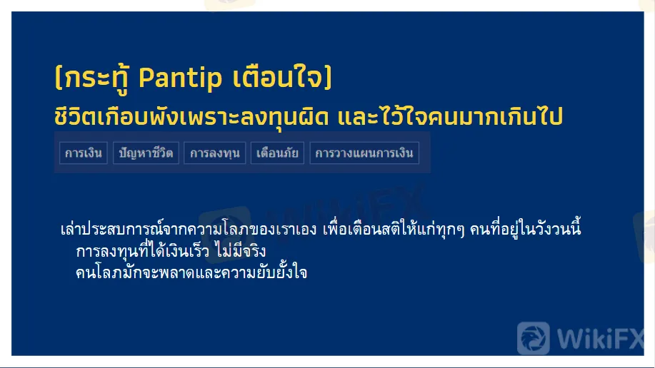 จากเหตุการณ์ครั้งนี้บอกอะไรเทรดเดอร์ Forex ? รูปแบบการลงทุนในกระทู้ Pantip นี้คล้ายคลึงกับแชร์ลูกโซ่ /กองทุน และการเทรด Forex เพราะมันบ่งบอกว่าถ้าเราโลภติดสบายไปลงทุนกับแชร์ลูกโซ่หรือกองทุนเถื่อน นั้นจะทำให้อดตายแทนมากกว่า และถ้าเทรด Forex โดยใช้ความโลภก็จะล้างพอร์ตเงินหายหมด ฉะนั้นตั้งสติ อย่าโลภ เอาพอประมาณ...