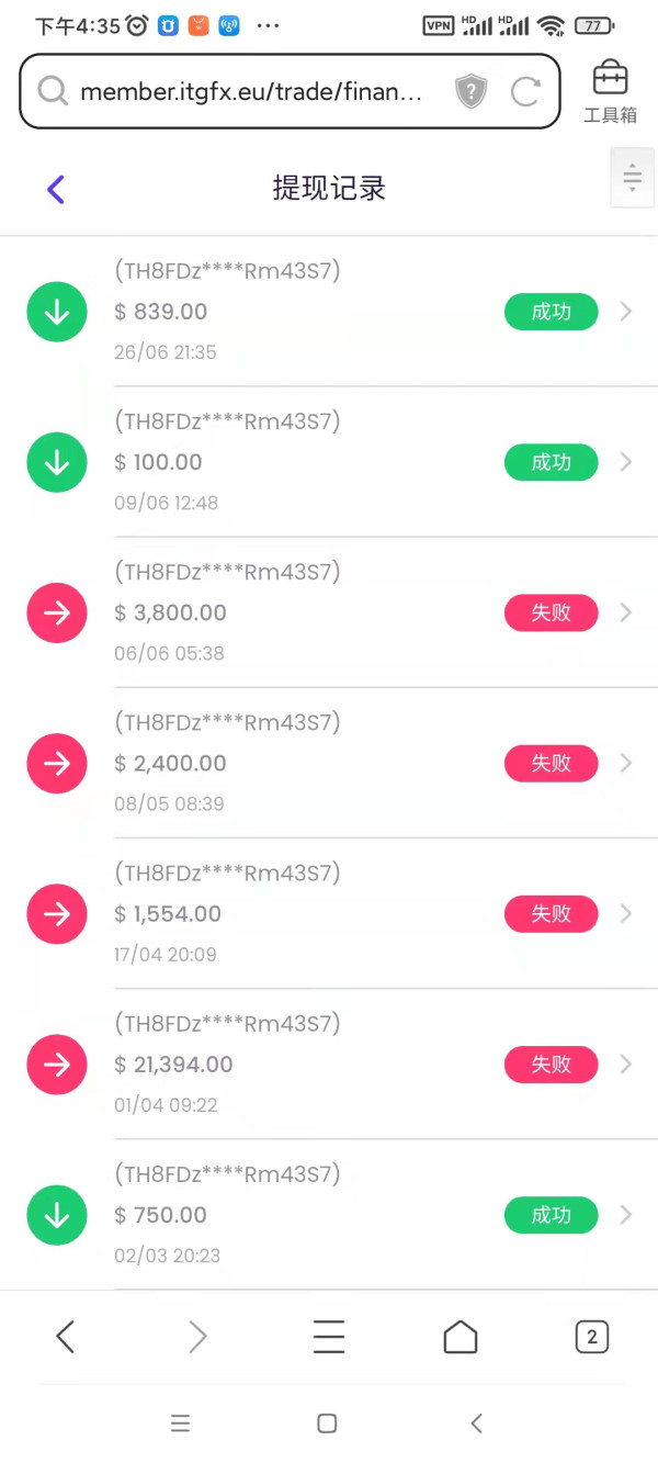 我是2021年7月经朋友介绍,加入ITG公司,直到2022年4月份,发现账户无法出金,2022.4-2022.6,提现出金多次,均提示失败(下面附[d83c][de36][fe0f]图片)公司给出来的理由是中国区政策影响,公司资金被冻结,漫长的3个月等待,6.5号公司有调整计划说和新的三分公司合作,6.5话以前的所有资金都重新被锁定3个月,不能出金,收益可以出金,直到2022.7.19号收到公司紧急通知,说公司账户被黑客攻击,现在所有账户爆仓,本人名下现在3个账户的余额均以为负数(下面有附图),希望平台可以帮助追回损失