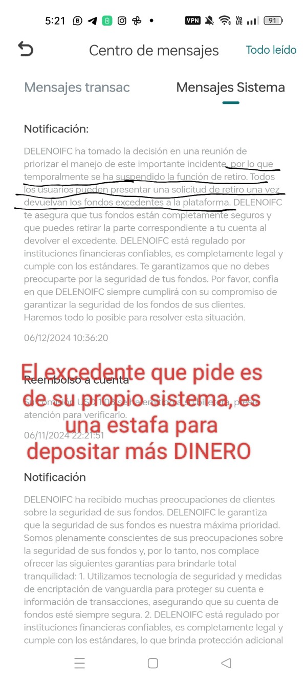 Deposite el 24 de abril del presente año 99 dólares queriendo generar ingresos extras a través de forex en la plataforma de deleno un equipo de expertos nos enviaban señales de lunes a jueves para poder hacer transacciones, la plataforma nos garantizaba una seguridad y por lo mismo es que deposité 277 más para tener un mejor ingreso extra eso lo hice el día 10 junio del presente año y el día 11 de junio en la madrugada por un error de sistema según el broker se había duplicado la cantidad la solución que ellos daban según sus mensajes en el sistema era reembolsar lo que se duplicó de cantidad para poder tener retiros y esto ya generaba desconfianza en la comunidad que estábamos trabajando con ellos. después de una semana de no haber solución de otra manera nos empezaron a comunicar que la las autoridades de Estados Unidos pedían que para poder liberar las cuentas se depositará el 10% de una penalización y que con eso se podrían hacer retiros el día 27 de junio hice un depósito por $53 para poder retirar el saldo confirmando la plataforma o broker que al día 28 junio del presente año a las 6 de la tarde hora Washington se iban a dispersar esos retiros después pasadas las 6 de la tarde no hubo ningún depósito y el día 29 de junio ya la plataforma No se podría abrir ni llegó ningún retiro por lo cual solicito su ayuda para hacer válida la garantía que generaba esta plataforma y rescatar el dinero.