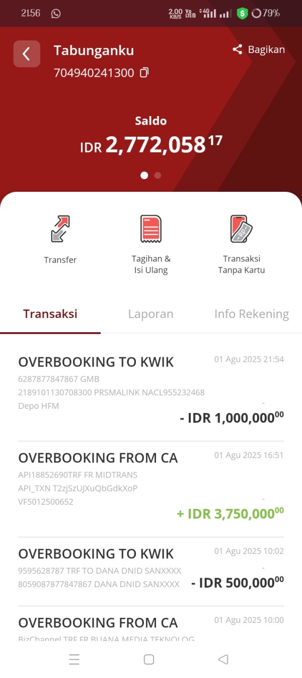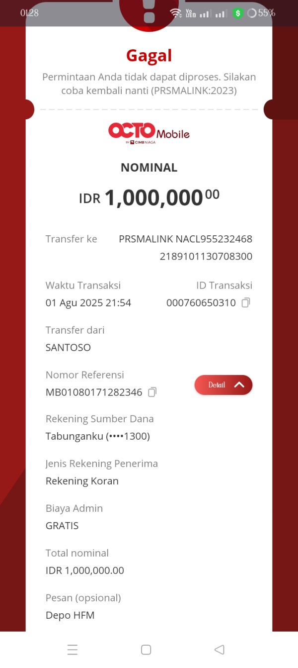 saya pada tanggal 1 Agustus 2025 21:54 ,, melakukan deposit ke pihak HFM dengan jumlah deposit 1.000.000 ,, metode bank tranfer,, 704940241300 deposit ke no rek 2189101130708300 dan kode PRSMALINK NACL955232468 yang saat ini belum masuk ke akun saya,,,di status trx saya gagal tapi saldo saya terpotong