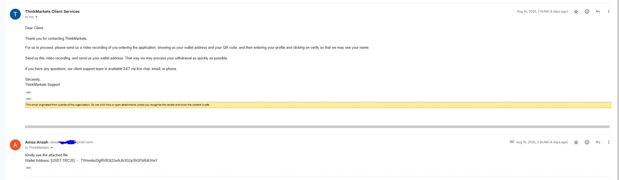 Hello FPA members, I am raising a serious issue with ThinkMarkets, a CFD brokerage regulated under FCA (UK), ASIC (Australia), CySEC (Cyprus), Withdrawal Request ID: 12D82 Method: Crypto Date Submitted: 15/08/2025 at 08:56 Status: Still pending after more than 5 days Here are the key issues: I provided all requested recordings, yet the withdrawal remains unprocessed. Whenever I contact support via live chat, I’m told the issue has been “forwarded to finance.” The finance team is completely unresponsive – I have sent countless emails to finance@thinkmarkets.com and received no reply. My account manager (Rivash Gudar) is also not communicating with me at all. This is not even about profits – my capital is not being addressed. This lack of transparency and refusal to process withdrawals raises serious compliance concerns under FCA client money rules (CASS) and equivalent obligations with ASIC, CySEC.