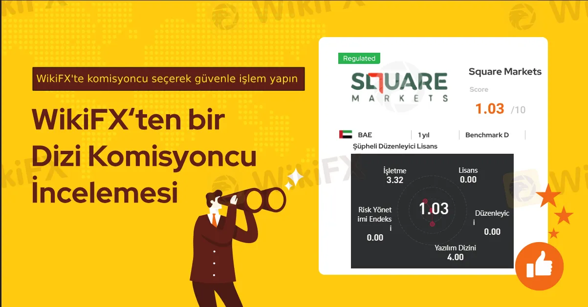 Square Markets internet sitesine göre bu firma resmi lisans sahibi bir forex komisyoncusudur. Ancak WikiFX yetkilileri bu firmanın lisansını doğrulatamamıştır. Ayrıca bu firmayla ilgili olarak son 3 ayda 27 farklı şikayet WikiFX yetkililerine ulaşmıştır. Bundan dolayı WikiFX bu komisyoncuya 1.03/10 gibi düşük seviye bir puan vermiştir.