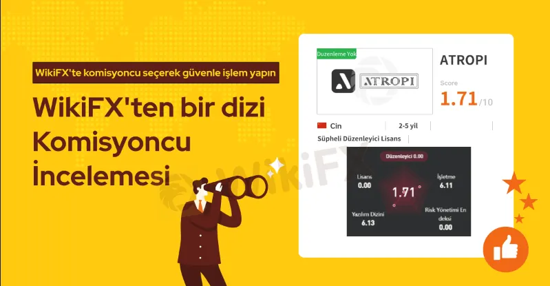 Atropi resmi lisans sahibi bir forex komisyoncusu değildir ve WikiFX araştırmalarına göre bu firmanın lisansı geçerli değildir. Ayrıca bu firmayla ilgili olarak son 3 ayda 9 farklı şikayet WikiFX yetkililerine ulaşmıştır. Bundan dolayı WikiFX bu komisyoncuya 1.71/10 gibi düşük seviye bir puan vermiştir.
