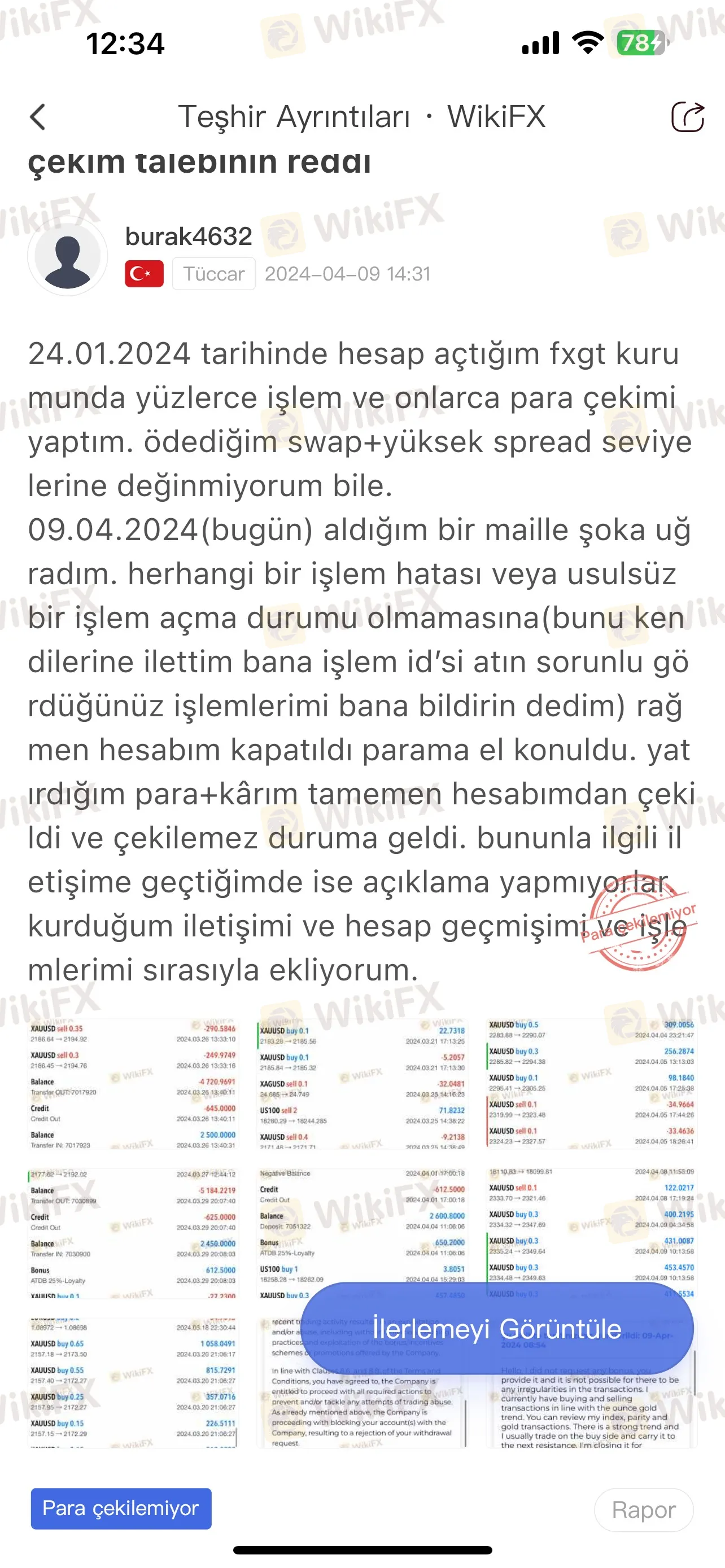 Geçtiğimiz hafta, birçok forex yatırımcısı FXGT tarafından zarara uğratıldıklarını bildirdi. Yatırımcılar, hesaplarının hiçbir açıklama yapılmaksızın kapatıldığını ve hem karlarının hem de ana paralarının bloke edildiğini ifade ettiler. Bu durumu, WikiFX teşhir sayfası üzerinden bizimle paylaşan yatırımcıların vurguladığı ortak nokta hesaplarının kârda olması ve herhangi bir gerekçe gösterilmeden kapatılması. Bu işlem sonrasında yatırımcılara, kural ihlali yapıldığına dair bilgiler içeren bir e-posta gönderilmiş. Ancak yatırımcılar, herhangi bir usulsüz işlem yapmadıklarında hemfikirler. Firmanın ise bu konuda herhangi bir açıklama yapmadığı belirtiliyor. Ayrıca, geçen hafta firmanın 50'den fazla yatırımcının hesabını benzer şekilde kapattığı bilgisi edinildi. Güvenliğiniz için, bu olayların nedenleri netleşene kadar FXGT ile işlem yapmamayı öneriyoruz.