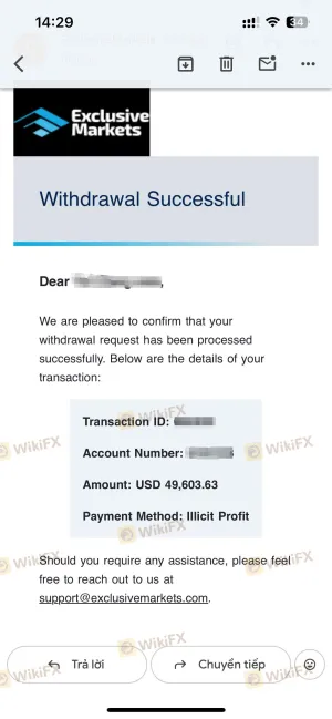 Tôi là khách hàng đã mở tài khoản giao dịch tại sàn Exclusive Markets và tham gia giao dịch theo đúng các điều khoản mà sàn công bố. Tài khoản của tôi được cấp đòn bẩy 1:4000 theo chính sách của sàn. Trong quá trình giao dịch sản phẩm XAUUSD, tôi hoàn toàn sử dụng đúng mức đòn bẩy do sàn cung cấp và thực hiện lệnh theo cơ chế thị trường. Tại thời điểm thị trường biến động mạnh, tôi đã có lợi nhuận hợp pháp từ các giao dịch của mình. Sau khi tổng lợi nhuận đạt 50.037 USD, tôi đã thực hiện yêu cầu rút tiền theo đúng quy trình. Tuy nhiên, sàn Exclusive Markets đã không tiến hành thanh toán số tiền trên. Không những vậy, toàn bộ số tiền lợi nhuận của tôi đã bị chuyển ngược trở lại hệ thống của sàn và vu khống tôi vi phạm thanh khoản. Nghiêm trọng hơn, tài khoản giao dịch của tôi đã bị khóa và tôi không thể đăng nhập để truy xuất dữ liệu, lịch sử giao dịch hoặc bằng chứng cần thiết nhằm làm việc với cơ quan chức năng.