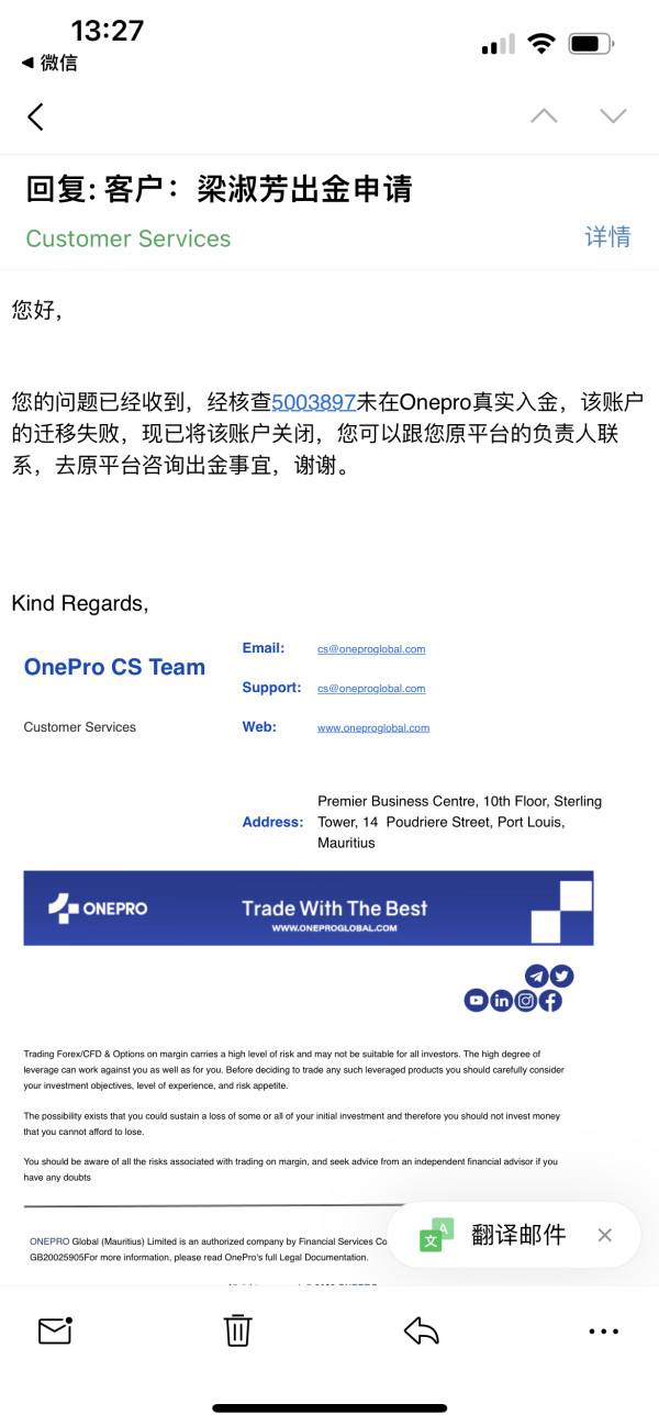 我这里是onepro的客户,原先的交易平台ebro和onepro合并。把我们的账户都转移到了onepro,目前交易了一个月了,想申请出金。但是onepro用各种理由不给出金。说没有收到原先平台的钱,还把我们账户冻结了。作为一个公司。你们没收到钱就接收客户的账户,而且资金,交易记录都有。我觉得是两个平台串通坑我们的钱。而且我都是大亏损账户。实在不行,我这里只能走法律途径了。