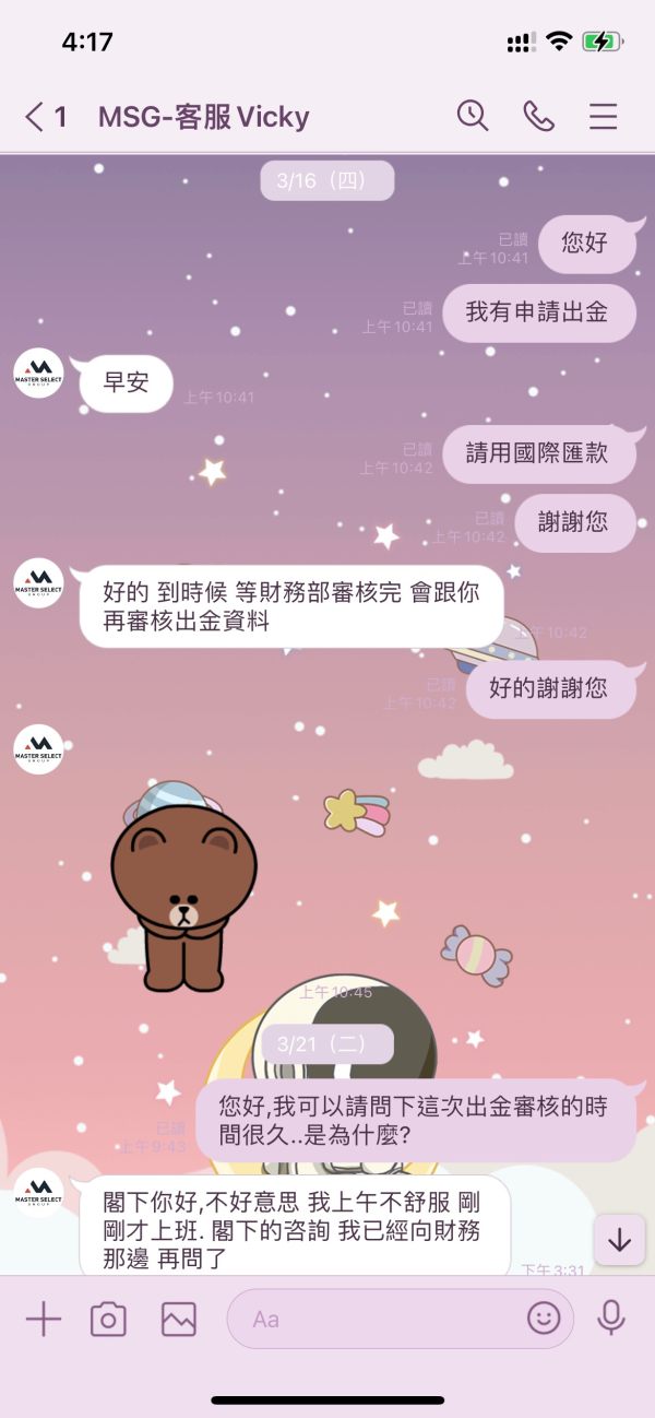 2023/3/16申請出金美金4700元,2023/3/24仍舊沒法得到任何出金的狀態更新。客服一直說是還在審核。 客服讓我寫信到support@msgforex.com,信件無法寄送。客服說幫我傳給財務也都沒有正面回覆。 撥打官網上的電話是空號。