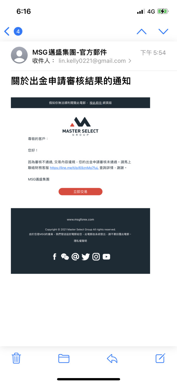 2023年3月30日我將所有的倉位平掉,並且申請出金美金3400元(帳戶共有美金3456元)。 2023年4月4日下午收到MSG發信給我,指稱我交易違規,無法出金。 我當下問了MSG提供的客服的line,客服指稱需要詢問財務。但是截止今天早上都沒有回覆為什麼拒絕出金。只是一直說需要等待財務。 上次拒絕出金讓我等了兩週,後來給我的理由是Visa查我的交易紀錄。我說那是不是以後都不能用信用卡入金,MSG說用信用卡入金一樣是可以的。這次不知道是什麼原因說我交易違規。 我也同樣發信給support@msgforex.com,信件仍舊被彈回來。 網站上提供的公司電話依舊是空號。