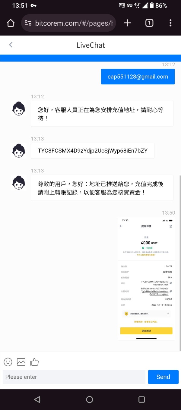 一開始是在ig上有一個陌生女士找我聊天,後面聊一聊說他們珠海那邊ig不方便聊天要求加line,前面幾天聊天都很正常,後面打電話給我跟我說他們公司有在入侵一些公司的數據來達到獲利開始找我一起放幣在平台上,一開始有透過先放幣在okx交易app平台上,再轉到她給我上面bitcorem這個網址上。買幣過程她有提供一個人的帳戶給我讓我匯錢過去給她買幣。一開始確實獲利了也有拿回錢,後面開始慢慢讓我多放一些錢在她給我的平台上面,她請我放10萬進去的時候,我有跟她說如果妳願意在我這帳戶上放13萬進來我就放,結果她為了得到我信任真的放了進來。這種情況讓我開始上網查詢這是不是一個詐騙,所以我昨天去到她給我的平台網址上想把前提現出來,發現一直在審核中就是沒辦法提現出來,問客服卻是跟我說沒有交易流水無法提現,她幾乎每天都會用通話的方式跟我說話,她想跟我視訊,但只有我開而已,這部分她跟我說因為他們公司在做入侵其他公司這部分所以公司規定不能開攝像頭不能拍照,打電話的部分白天晚上都會