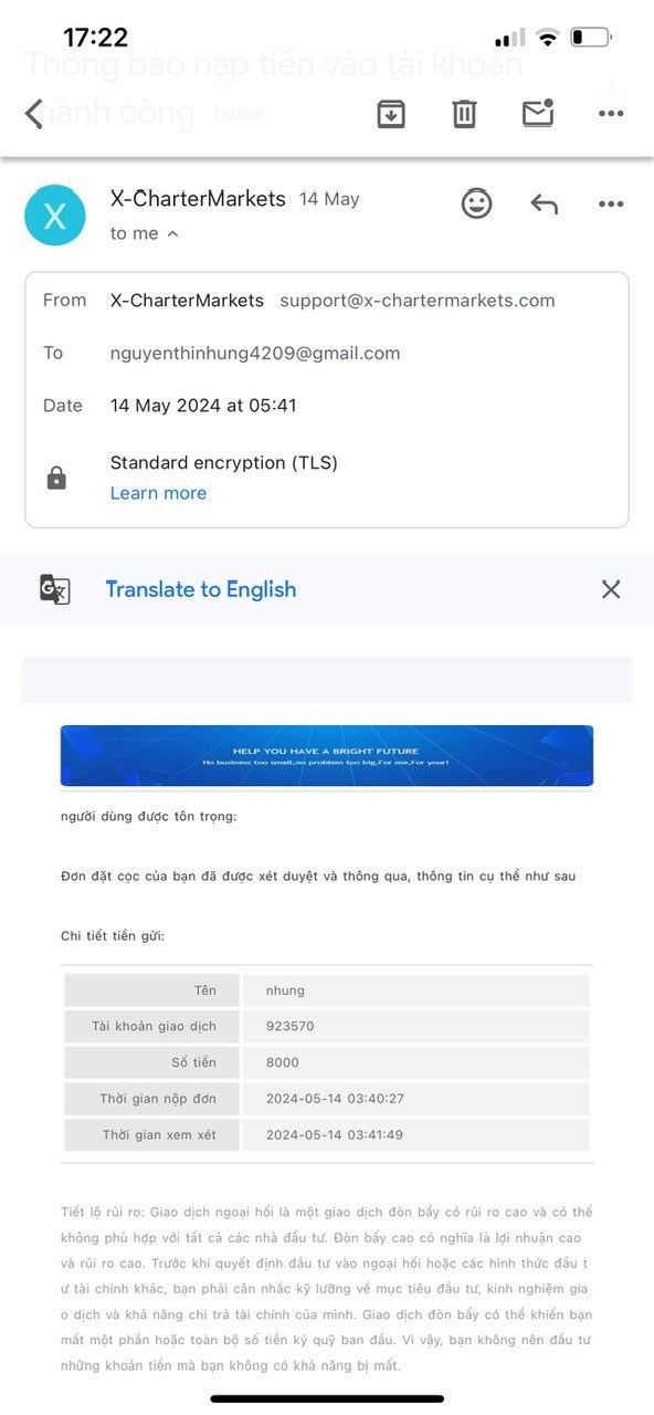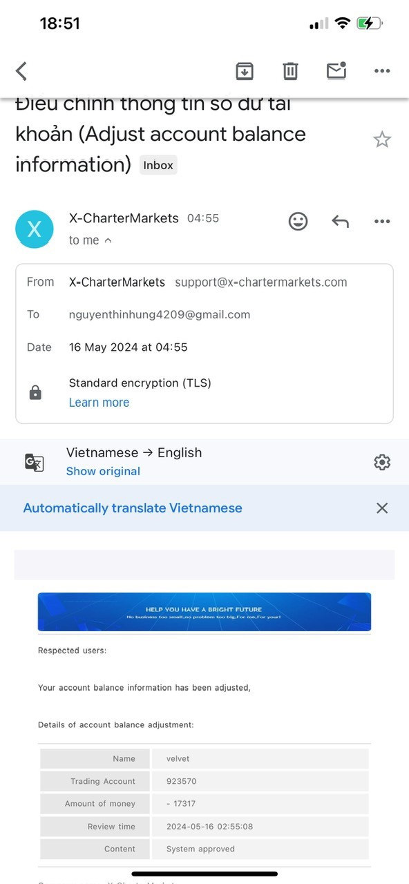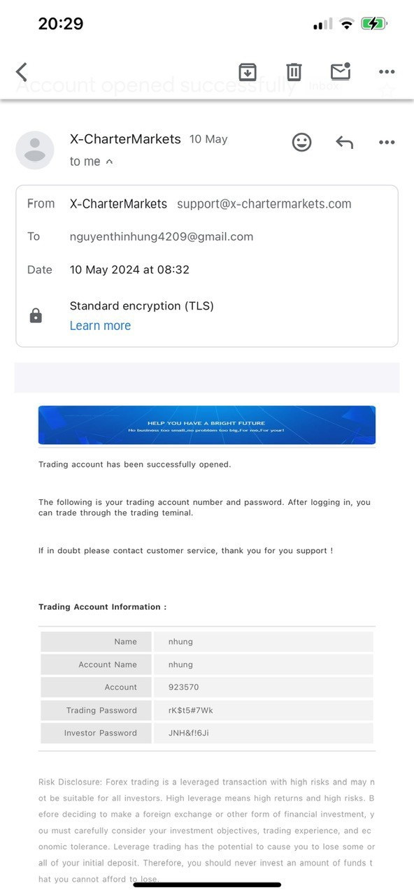 I opened an account ̣( 923570) with X Charter in May and deposited $18800. The local X Charter representative ensured me that everything was safe. In five days of little trading, my account was terminated. The positive balance on it was confiscated with no explanation. All contacts were dead so I didn't get any response.