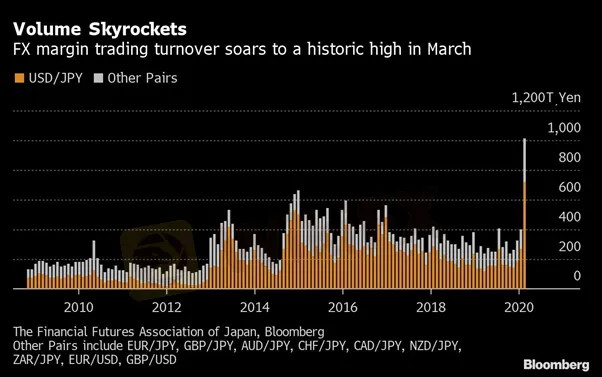 Khối lượng giao dịch trong tài khoản kỹ quỹ ngoại hối riêng lẻ đã nhảy vọt lên 1015.6 nghìn tỷ yên (tương đương 9.4 nghìn tỷ USD) trong tháng 3 từ mức 403.1 nghìn tỷ yên trong tháng 2, theo Hiệp hội tài chính tương lai Nhật Bản. Khách hàng hầu hết thuộc nhóm nam giới trung niên, những người trước đây chỉ có thời gian giao dịch sau khi hết giờ hành chính. Đồng thời cũng có sự gia tăng đáng kể về khối lượng giao dịch cặp USDJPY so với tháng trước, với con số cụ thể gần 721.4 nghìn tỷ yên, tăng gấp 3 lần và chiếm hơn 70% tổng số doanh thu.