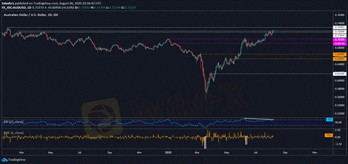 Sau nghị quyết về lãi suất vào ngày 4 tháng 8, hôm nay (07/08) Ngân hàng Trung ương Úc sẽ đưa ra tuyên bố chính sách tiền tệ, đồng đô la Úc sẽ trở thành tâm điểm chú ý của thị trường. Kể từ giữa tháng 3 đến nay, tỷ giá AUD/USD đã tăng 25%; quá trình tăng đã phá vỡ nhiều lớp kháng cự.