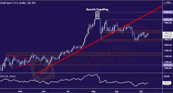 Giá vàng tiếp tục củng cố sau khi giảm xuống mức thấp nhất trong hai tháng vào đầu tuần trước, đà phục hồi yếu, khó vượt qua ngưỡng hỗ trợ trước đó tại vùng 1911.44-1928.82 cho thấy xu hướng ngắn hạn vẫn là giảm.