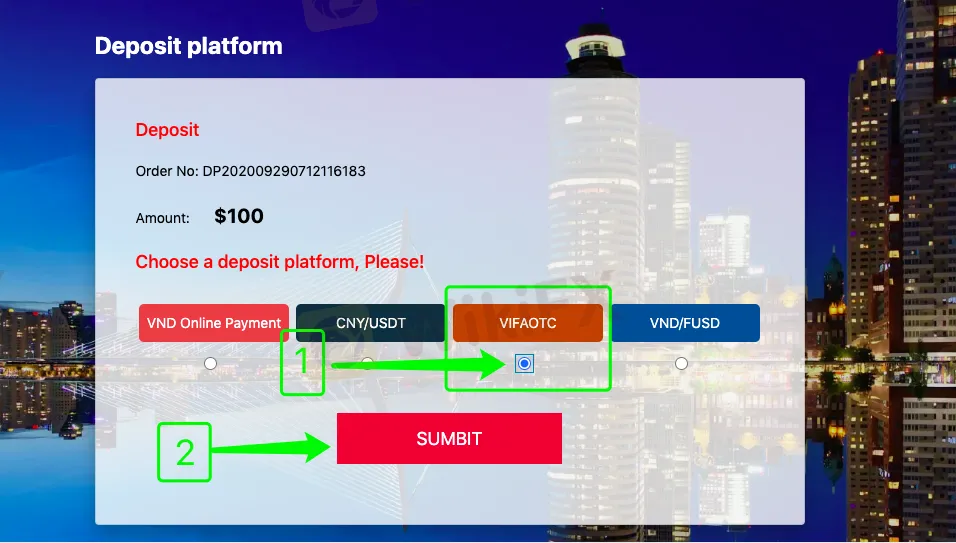 VIFA OTC là một nền tảng giao dịch tiền tệ kỹ thuật số được mã hóa không cần kê đơn (OTC) cho phép giao dịch hai chiều giữa các nhà giao dịch tiền tệ. Thông qua phương thức thanh toán này, khách hàng có thể chuyển tiền vào tài khoản BTFPrimethông qua tài khoản ngân hàng Việt Nam.