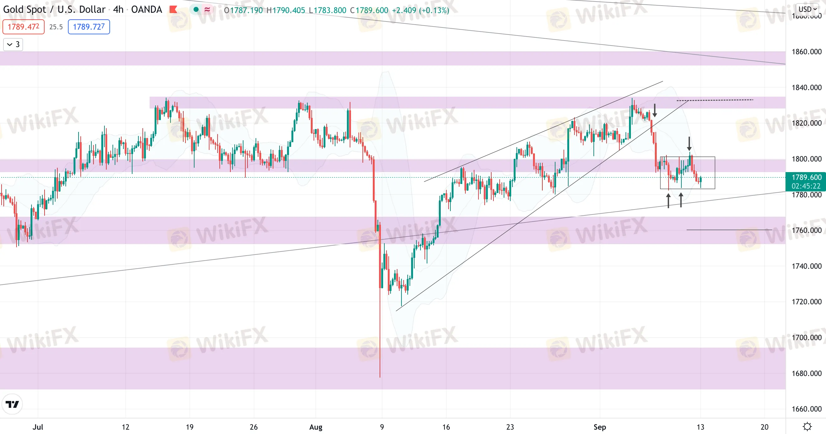 Vàng giảm giá trong phiên cuối tuần nhưng chưa thể thoát khỏi chiếc hộp. Như đã nói, do vùng 1780 là vùng hỗ trợ hợp lưu với đường xu hướng tăng dài hạn bị false-break trước đó, nên mặc dù đang có các tín hiệu ủng hộ khả năng giảm nhưng chúng ta không nên bán lúc này.