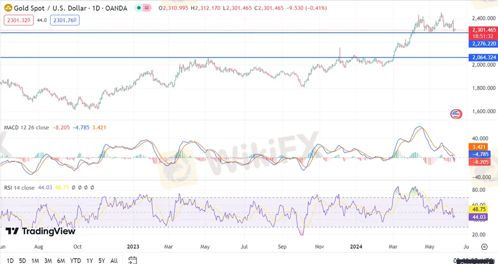 Giá vàng đang chuyển sang xu hướng giảm với đường 50 MA cắt xuống dưới 200 MA và RSI đi xuống dưới mốc 50. Chúng tôi tìm kiếm mức quan trọng quanh khu vực 2275. Nếu giá xuống dưới mức 2275, chúng ta có thể kỳ vọng giá sẽ tiếp tục giảm và chạm mức kháng cự trước đó là 2200 và 2000.