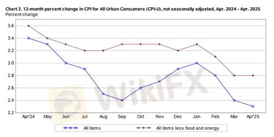 Chỉ số giá tiêu dùng (CPI) của Mỹ đã giảm liên tiếp trong 4 tháng và thấp hơn dự báo thị trường. CPI chưa điều chỉnh theo mùa tháng 4 tăng 2,3% so với cùng kỳ năm ngoái, giảm 0,1 điểm phần trăm so với kỳ trước; CPI theo tháng tăng từ -0,1% lên 0,2%. Loại trừ thực phẩm và năng lượng, CPI lõi sau điều chỉnh theo mùa tăng 2,8% so với cùng kỳ và tăng 0,2% so với tháng trước, lần lượt không thay đổi và tăng 0,1 điểm phần trăm.