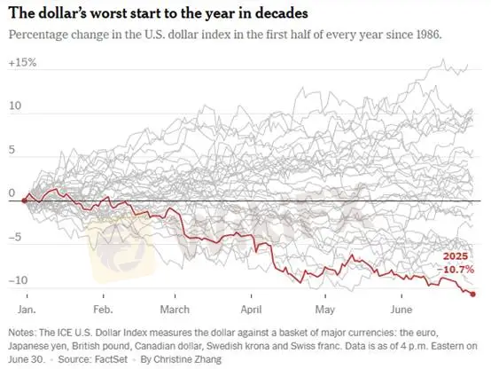 (Hình 1: Chỉ số USD giảm 10,7% trong năm nay; nguồn: The New York Times)