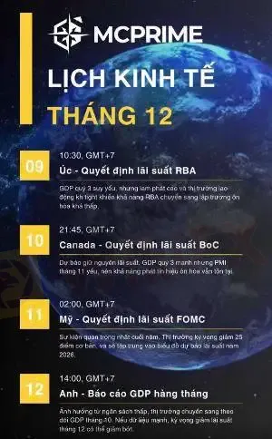 Mỹ – 02:00 : Quyết định lãi suất FOMC, thị trường kỳ vọng giảm 25 điểm cơ bản, tập trung vào biểu đồ dự báo lãi suất 2026.
