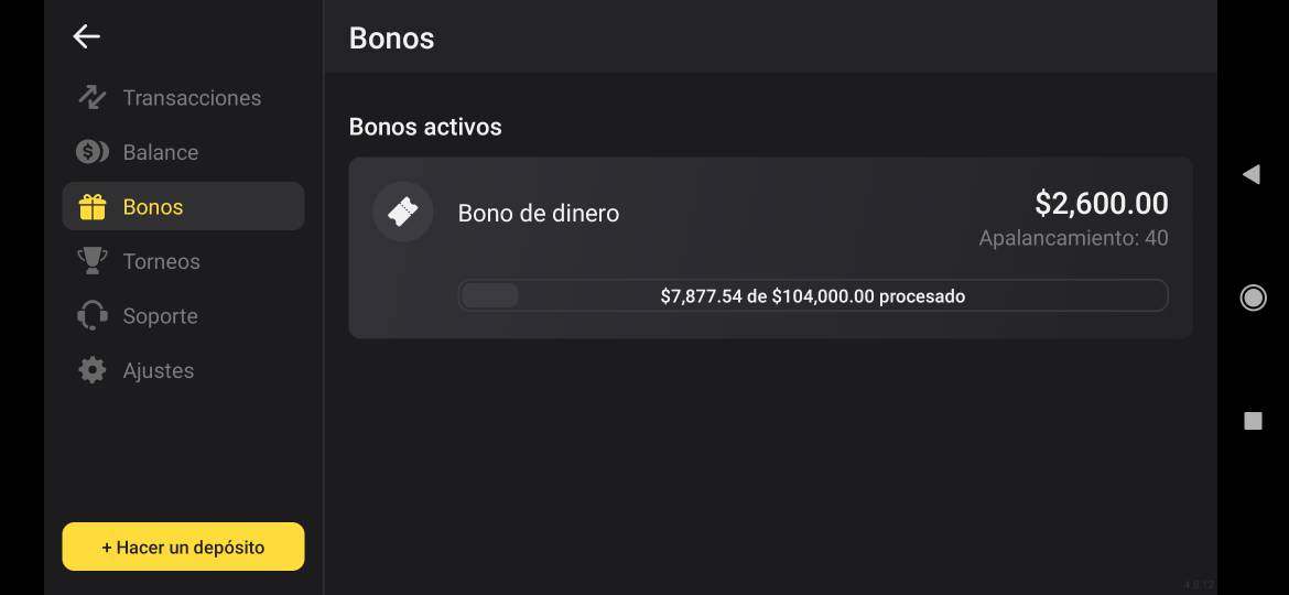 hice un depósito de $2000 pesos mexicanos (87 dólares aproximadamente) porque ví un bono del 130% por lo que me otorgaron $4600 y empecé a operar ganando unos 50 dólares, el problema fue al momento de retirar, no me permitía retirar nada hasta que consiguiera ganar la cantidad de 104,000 pesos (4550 dólares aproximadamente) por lo que empecé a creer que esto era una estafa ya que para llegar a esa cantidad de dinero tenía que operar mucho y ganar casi todas las operaciones. Tenganlo en cuenta.