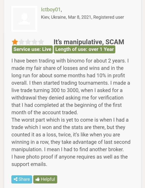 A client has complained that Binomo is a big manipulator as they declared one of his profits, which he earned through trading, a loss and rejected his withdrawal request many times. As a result, the client shifted to another broker.