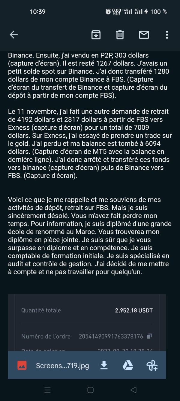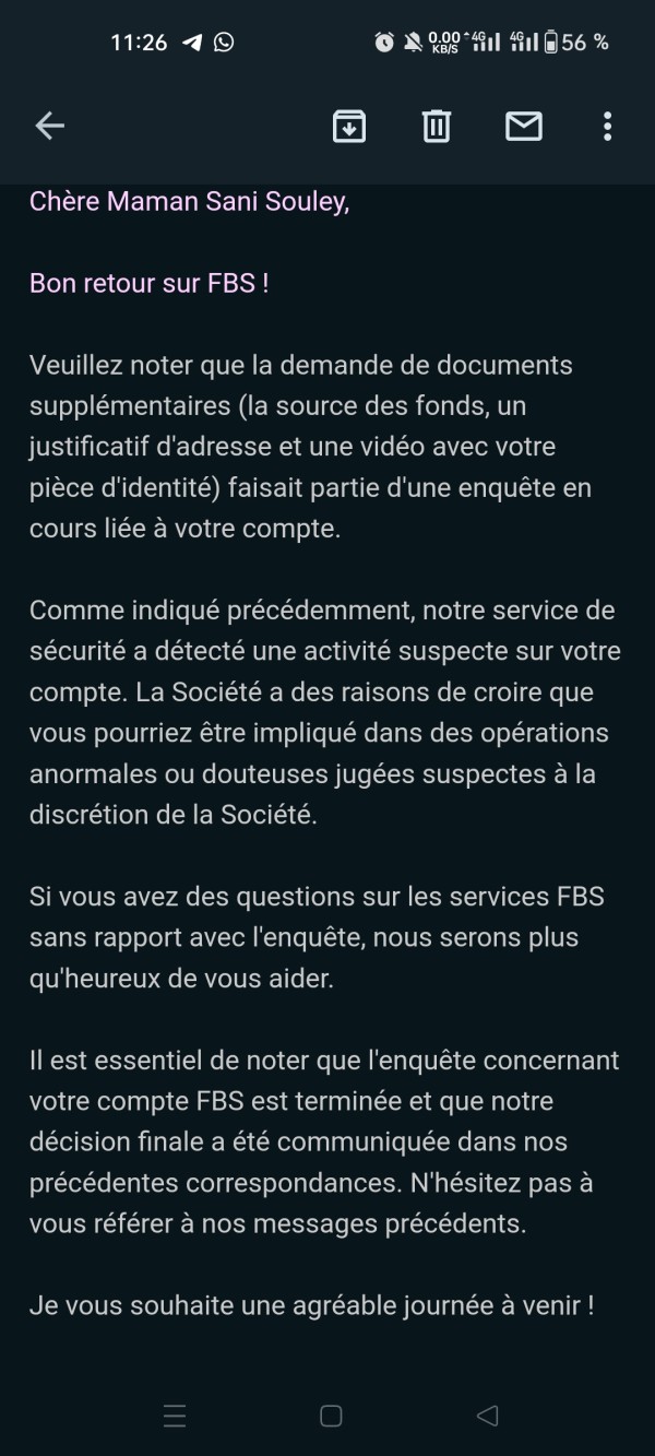 Je suis chez ce Broker depuis avril 2023. J'ai tradé sans problèmes jusqu'au jeudi 23 novembre où j'ai reçu un mail de leur assistance. Ils m'ont demandé des captures de mon relevé bancaire, comment et sur quel exchange j'ai acheté mes USDT, la vidéo de moi tenant mon passport. J'ai fourni toutes ces informations. Mon compte avait un solde de 12.500 dollars ce jour là. J'avais commencé avec 2.900 dollars. J'ai cramé le compte. 2 semaines plus tard j'ai fait un autre dépôt de 2.800 dollars. À partir de ce dépôt, j'ai commencé à réaliser des profits. Mon compte est passé de 2.800 dollars à 12.500 dollars. Ensuite ce jeudi là, le compte a été gelé. Je ne pouvais plus prendre de trades jusqu'à la fin de l'enquête d'après eux. Le lendemain, j'ai essayé de faire des retraits. J'ai réussi à retirer 10.000 dollars. 48h après, le compte est toujours bloqué. J'ai contacté l'assistance. Ils m'ont demandé d'être patients. 72h après, les 2.500 dollars restants ont été retiré de mon compte par FBS. Je contacte l'assistance pour savoir pourquoi ? Ils m'ont dit d'attendre aujourd'hui lundi 27 novembre 2023 pour connaître le motif. Aujourd'hui j'ai reçu leur mail. Voici leur message: