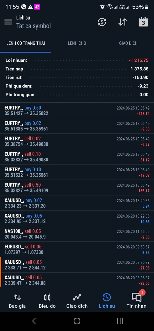 sàn kêu lệnh rút tiền của tôi bị lỗi, phải đi lệnh với mã EURTRY_ để hợp thức việc rút tiền và lệnh tự chốt sau vài phút, họ nói tiền sẽ về trong ngày. đợi không thấy tiền về, tôi liên hệ lại thì không được. người đã liên hệ tôi lại phủ nhận, nói là người của sàn Fonory. họ xóa sạch đoạn chat liên hệ trước đó, phủ nhận liên quan. Hành vi lừa đảo trắng trợn. Vừa hôm trước nói hỗ trợ tôi rút tiền, hôm sau lại nói mình là người sàn khác