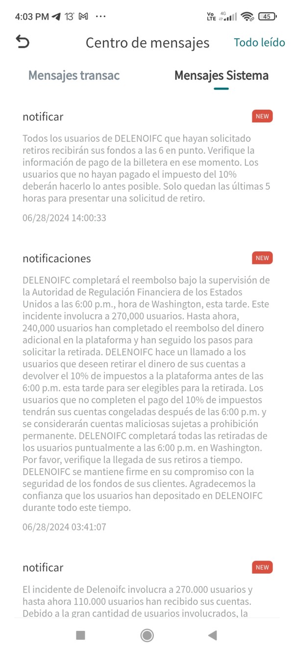 Expongo mi caso, ya que fui estafada por esta plataforma Deleno Ifc, invertí una cantidad de dinero y durante 5 días de la semana los líderes nos enviaban unas supuestas señal privilegiada para las transacciones diarias, el día 11-06-2024, según la notificaciones de la plataforma enviaron un comunicado diciendo que iban a hacer una actualización para disminuir los tiempos de retiro; posterior a la actualización, lo que sucedió fue la duplicación de los montos de los inversionistas, la cual se reflejaba en las cuentas de fondos de mi billetera. en virtud de ello a través de otro comunicado nos indicaban que estaban trabajando para revertir el error; y la solución que nos dieron es que teníamos que depositar la cantidad de dinero que por error había llegado a nuestras cuentas, cosa que no me parecía viable puesto que el error había sido de ellos y no de nosotros los inversionistas, posterior a eso en un nuevo comunicado decían que teníamos que depositar el 10% del monto total de la billetera que eso corresponde al impuesto que debíamos pagar por las transacciones realizadas. a la final todo resultó una estafa puesto que la plataforma borró todos los registros y el historial de esta aplicación. denuncio la situación ya que solicito una investigación y que los culpables paguen por todo los daños causados no solo financieramente si no los daños psicológicos ocasionados por esta fraudulenta aplicación, ya que constantemente DELENO IFC nos decían que para poder recuperar el dinero teníamos que depositar y a la final terminaron quedándose con absolutamente todo el dinero ya que los que depositaron jamás vieron reflejados en su respectivas billeteras de binance lo que nos correspondía, pido justicia para que no continúen saliendo este tipo de plataforma que lo que hacen es causar daños morales psicológicos a cientos de personas que confiaron en estos estafadores! Justicia