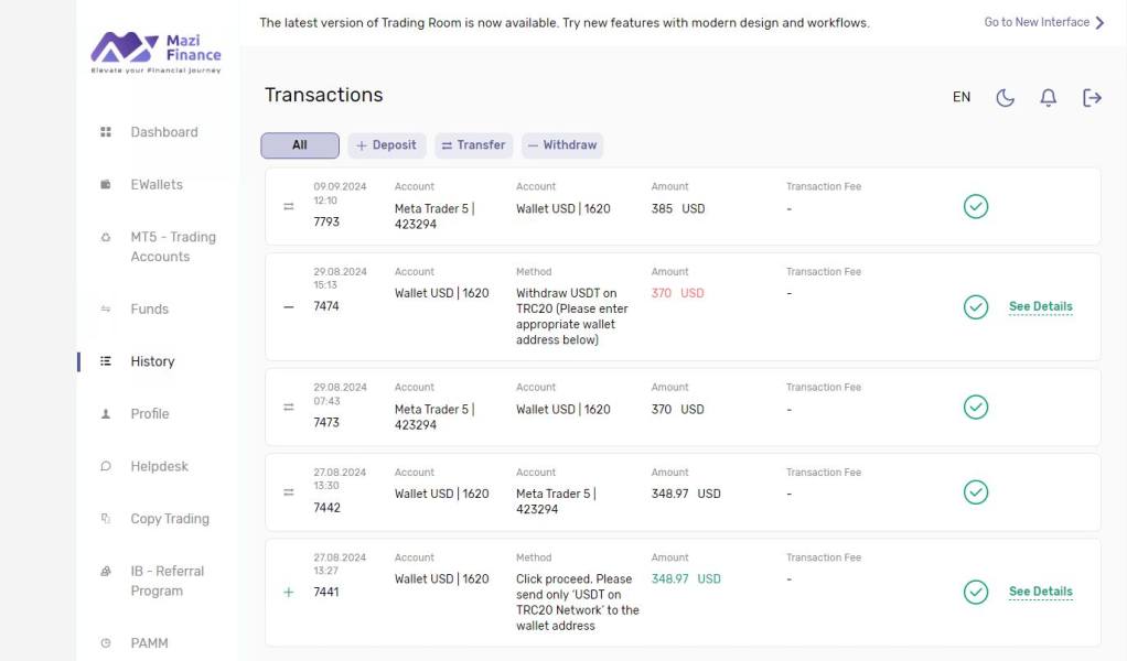 I was trading with Mazi for over a month. First withdarwal of my deposit they processed next day but now when I was asking for a 384 usd profit from my account 423294 they are not responding to my email and not proceeding with my request for over 2 weeks since 9th Sept 24. Hope they will sort this soon but so far this is my case
