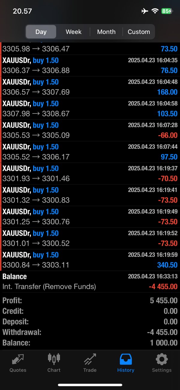 Saya mulai trading di HFM tanggal 9 April 2025 dengan modal $100 menggunakan EA. Trading berjalan normal dan withdrawal sebelumnya lancar. Namun saat melakukan WD sebesar $4.468 pada 23 April, statusnya pending dan keesokan harinya ditolak tanpa alasan jelas. Selanjutnya, akun saya langsung dibanned sepihak tanpa peringatan. Total profit yang dibatalkan sekitar $7.400.