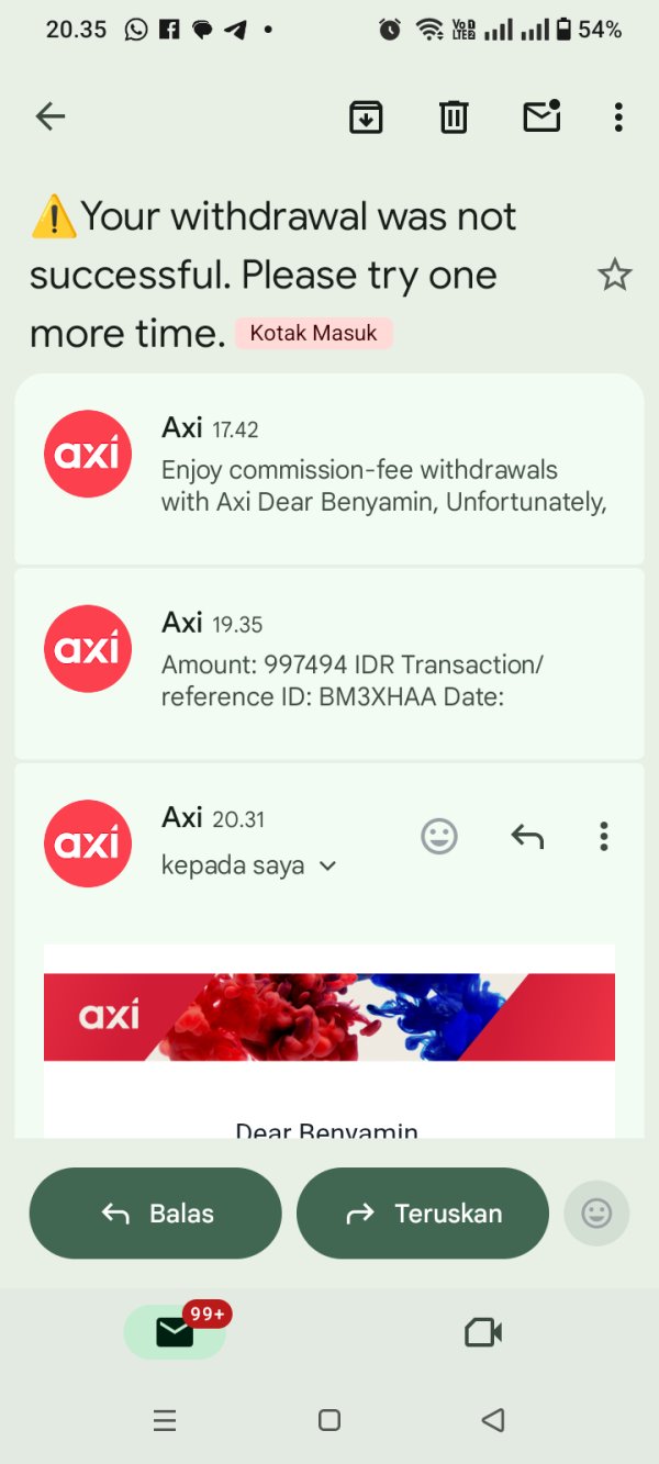 Awalnya saya bermaksud bergabung dengan broker axi karena nilai tinggi, tetapi realitasnya sangat berbeda Saya selalu tidak berhasil menarik uang dan selalu diberitahu untuk menunggu ketika menghubungi layanan pelanggan, saatnya telah tiba, saya mencoba lagi tetapi masih gagal. Broker ini memiliki nilai tinggi tetapi selalu gagal dalam penarikan uang dan jika tidak diselesaikan saya akan menambahkan orang ke daftar hitam